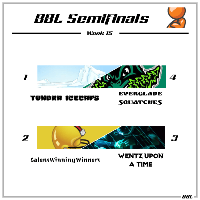 Welcome to the semifinal matchups for week 15! The Squatches and Wentz upon a Time won convincingly last week to move them into the final four this week. Here is a recap of those matchups.