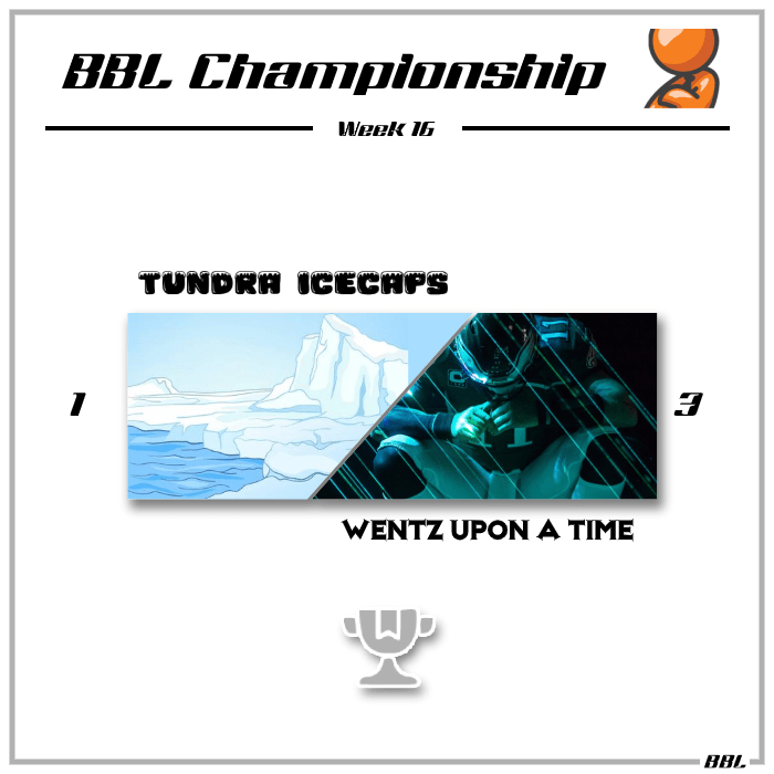Merry Christmas Eve! The time has arrived to crown the next champion of Books Boss League. Welcome to week 16, the final week of our fantasy football season. The Tundra Icecaps will battle Wentz upon a Time for both teams’ first ever Title.